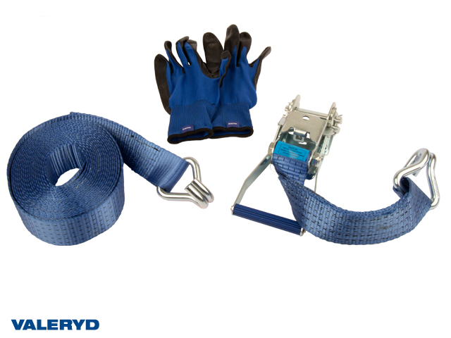 Spännbandsset 50mm med dubbla J-krokar, långt handtag. Längd 0,5+5,5m. 2500 kg (daN)